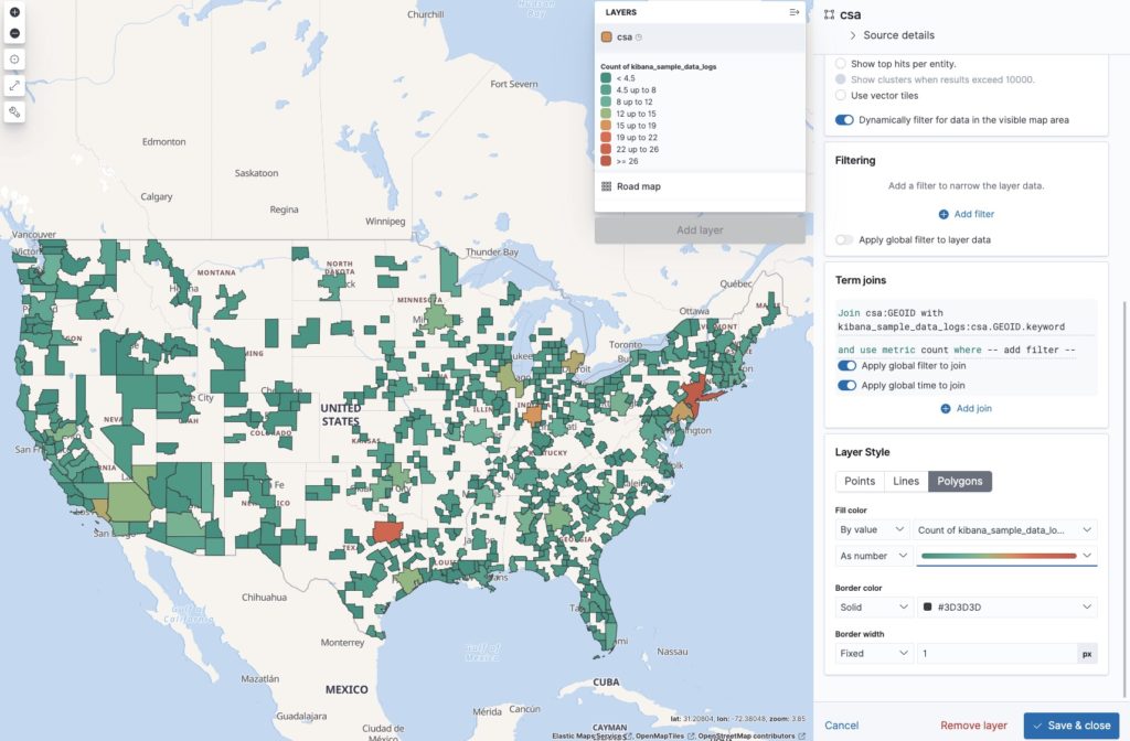 Elastic Maps come with a lot of great region options so you can get started quickly, but it also offers the ability to easily map your own regions. You can use any boundary data you’d like for this, as long as you have source data that contains a longitude and latitude.